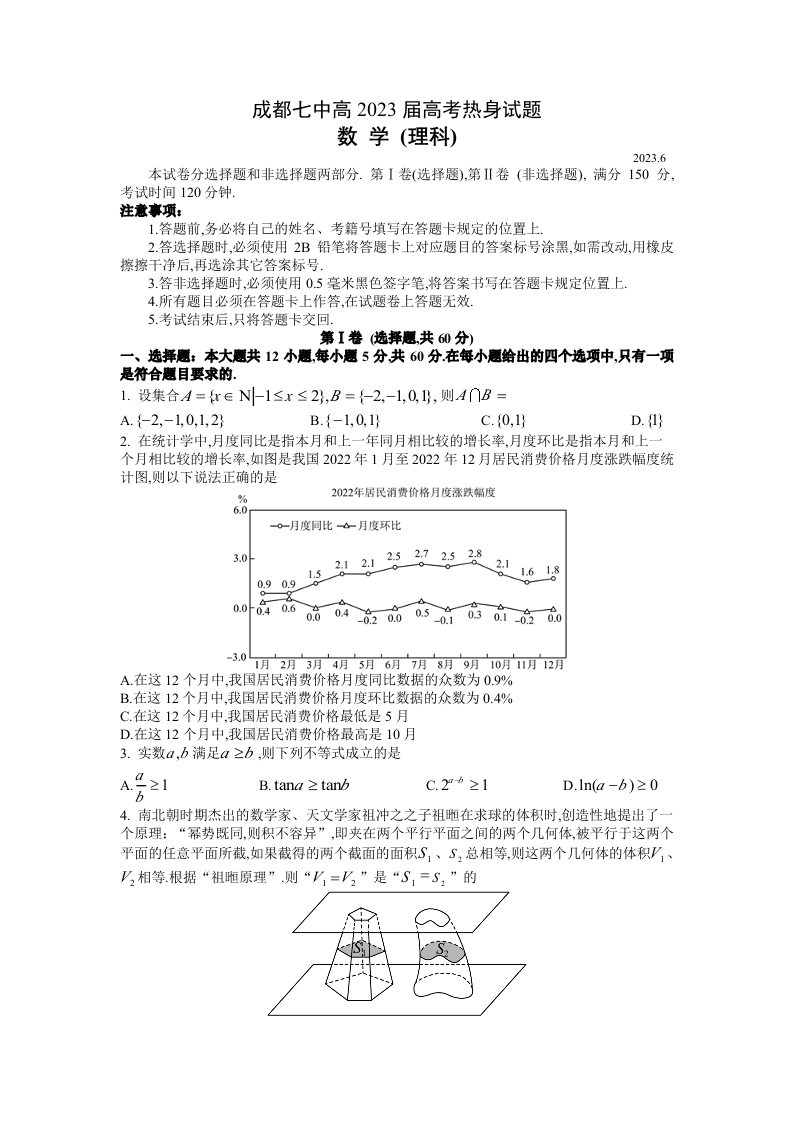 高三理科数学--四川省成都市第七中学2023届高三下学期热身考试