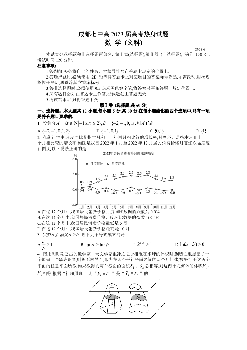 高三文科数学--四川省成都市第七中学2023届高三下学期热身考试