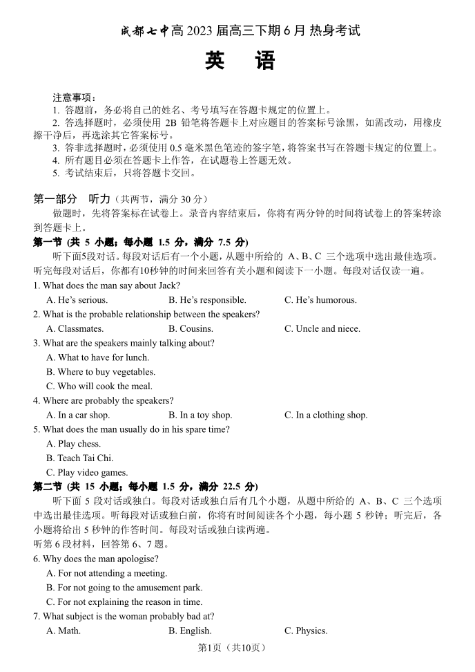 高三英语--四川省成都市第七中学2023届高三下学期热身考试
