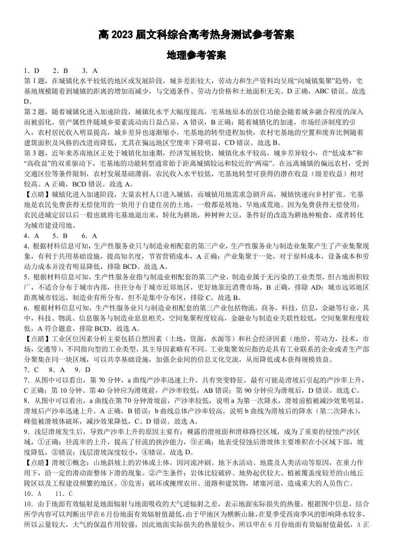 高三文综答案--四川省成都市第七中学2023届高三下学期热身考试