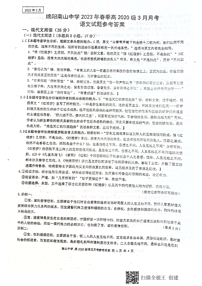 高三语文答案--四川绵阳南山中学2023届高三下学期3月月考(全科)