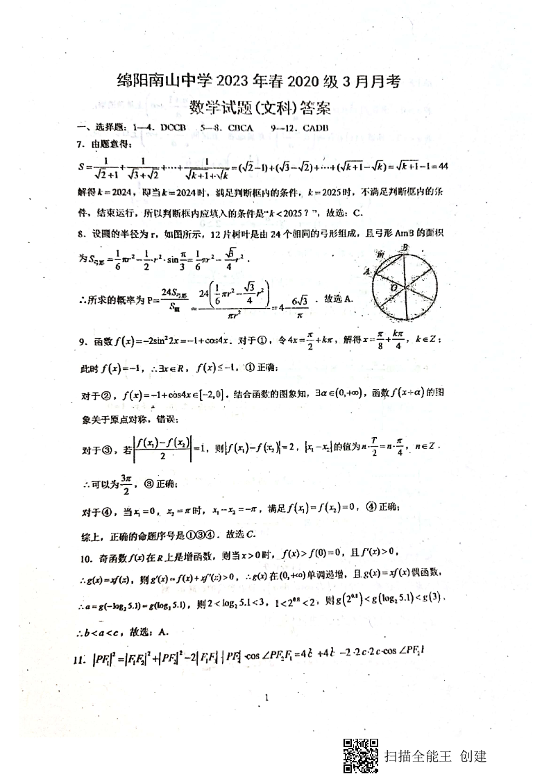 高三文数答案--四川绵阳南山中学2023届高三下学期3月月考(全科)