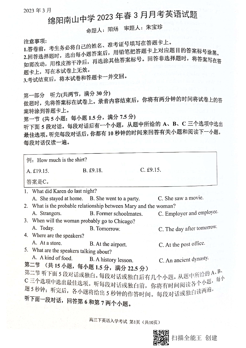 高三英语--四川绵阳南山中学2023届高三下学期3月月考(全科)