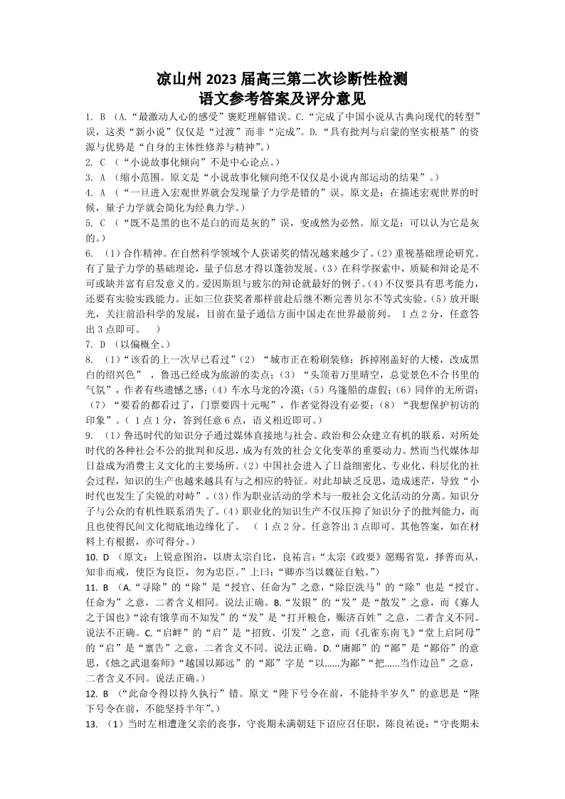 高三语文答案--四川凉山州 2023 届高中毕业班第二次诊断性检测(凉山二诊)