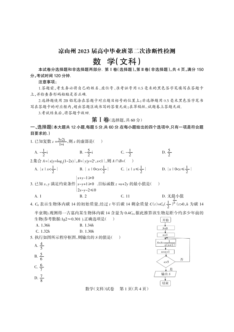 高三文数+答案--四川凉山州 2023 届高中毕业班第二次诊断性检测(凉山二诊)