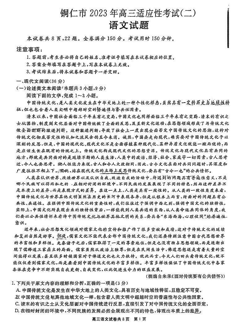 高三语文--贵州省铜仁市2023届高三适应性考试(二)