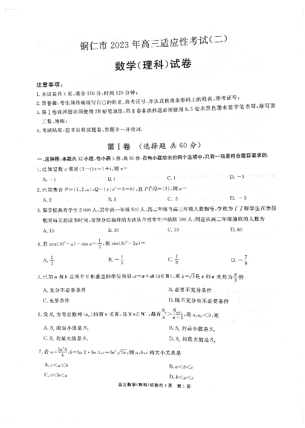 高三理数--贵州省铜仁市2023届高三适应性考试(二)
