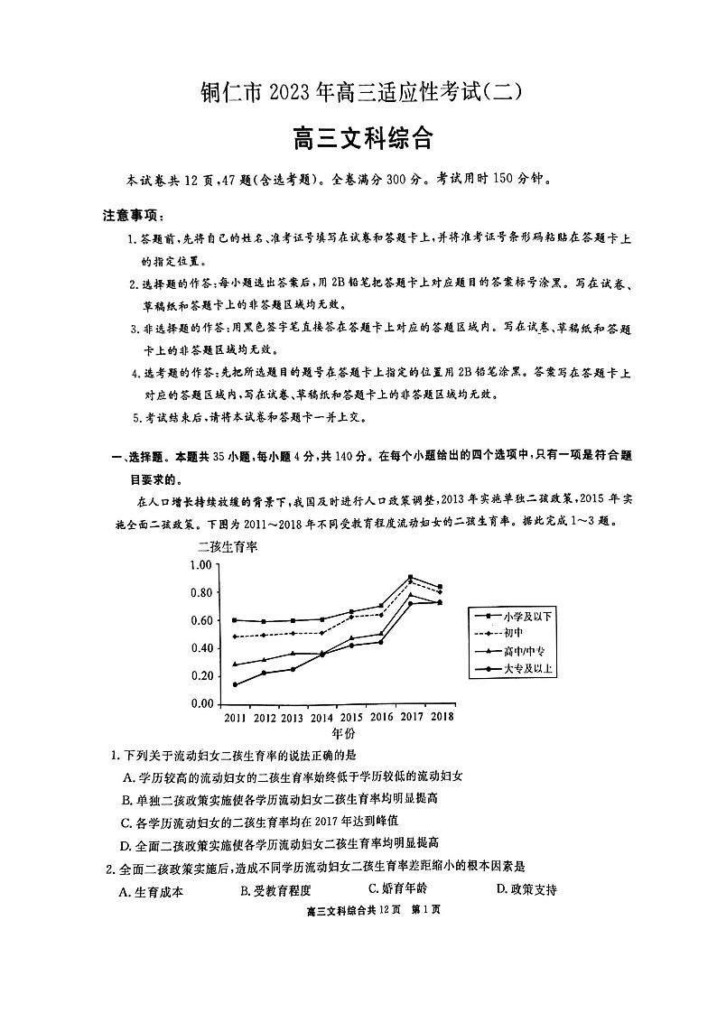高三文数--贵州省铜仁市2023届高三适应性考试(二)