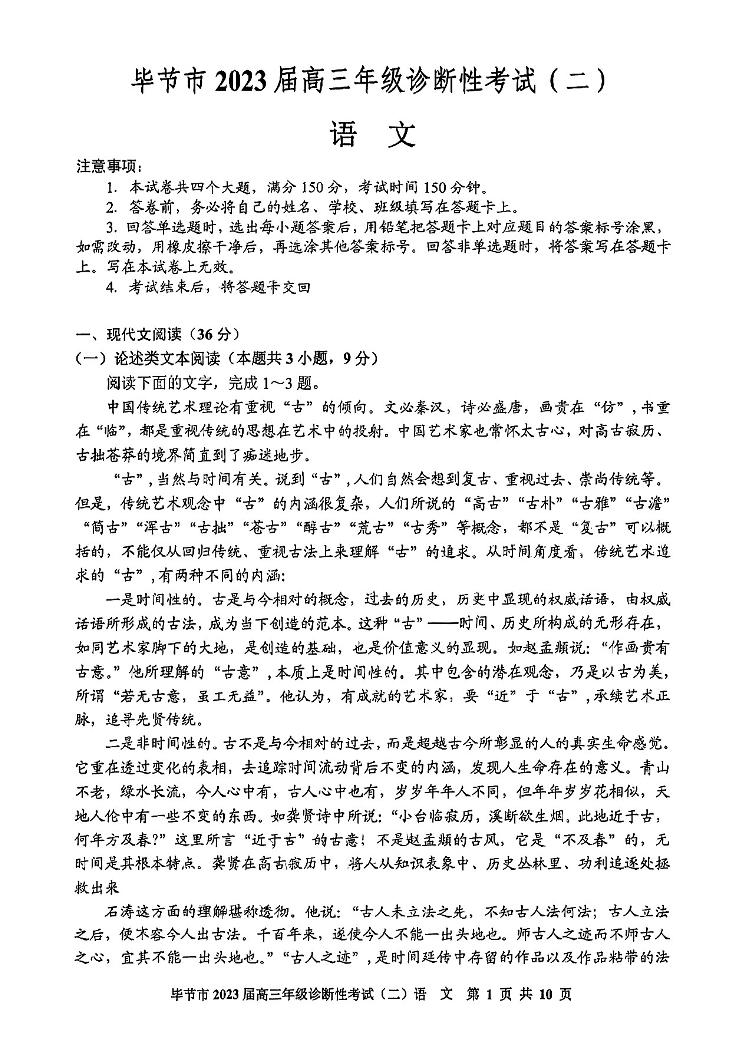 高三语文--贵州省毕节市2023届高三诊断性考试(二)