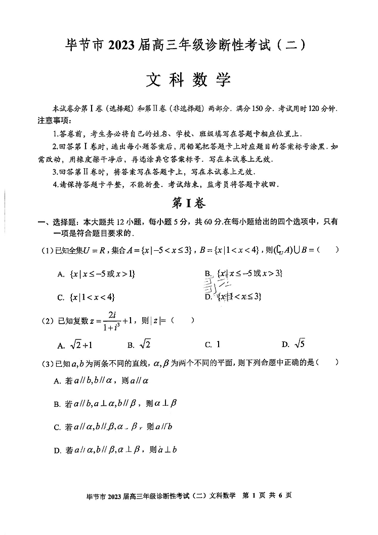 高三文数--贵州省毕节市2023届高三诊断性考试(二)
