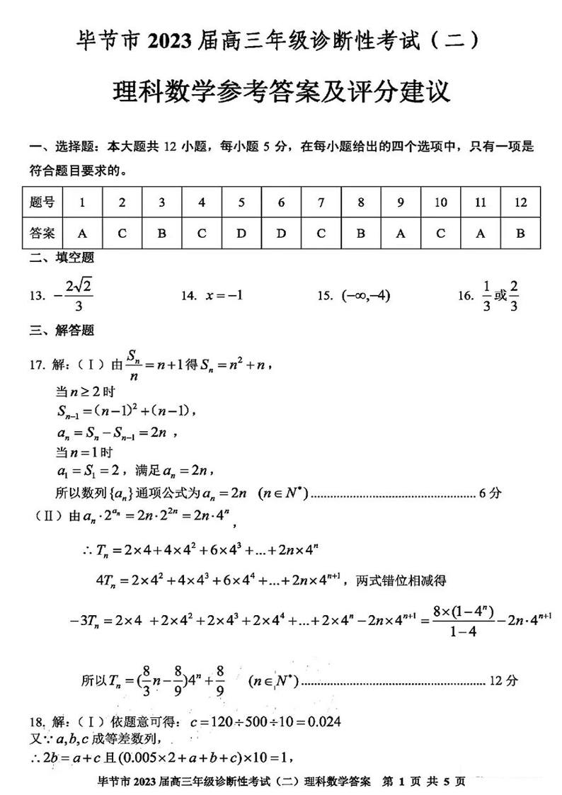 高三理数答案--贵州省毕节市2023届高三诊断性考试(二)