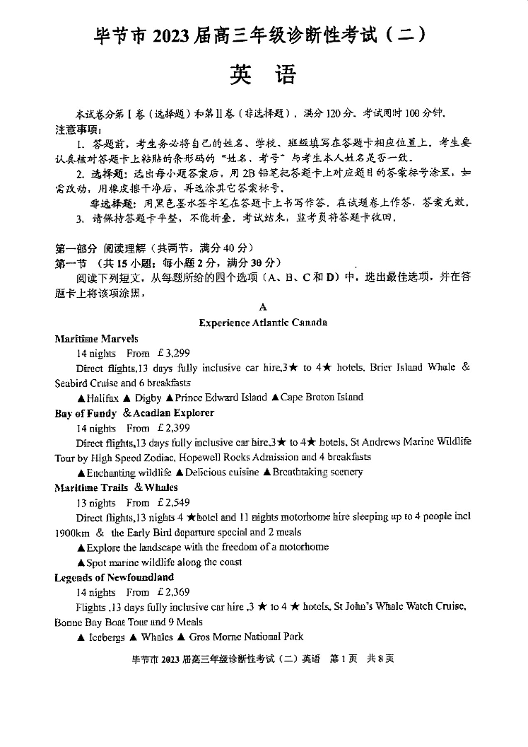 高三英语--贵州省毕节市2023届高三诊断性考试(二)