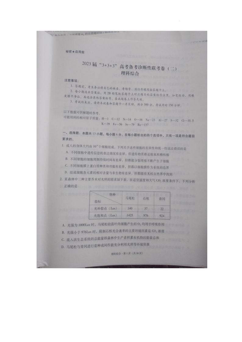 高三理综--贵州省2023届3+3+3高考备考诊断性联考(二)