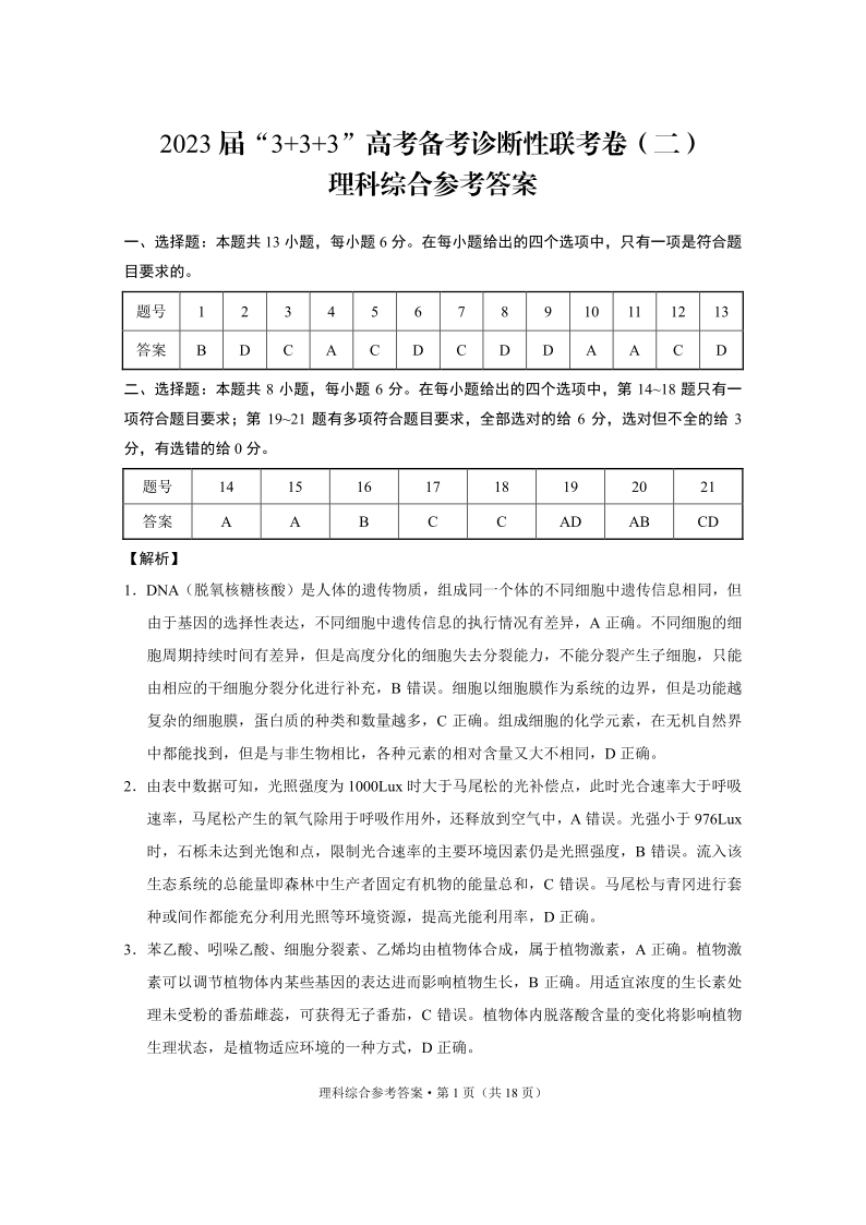 高三理综答案--贵州省2023届3+3+3高考备考诊断性联考(二)