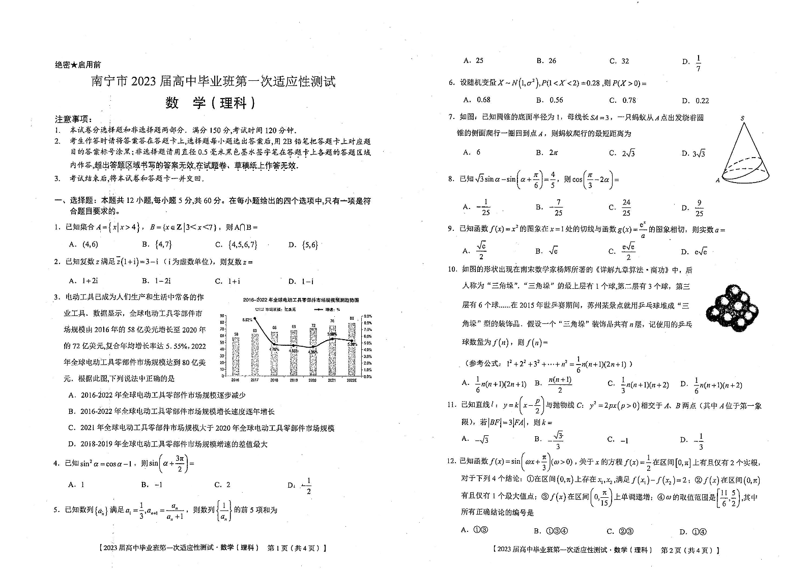 高三理科数学+答案--广西壮族自治区南宁市2023届高中毕业班第一次适应性测试