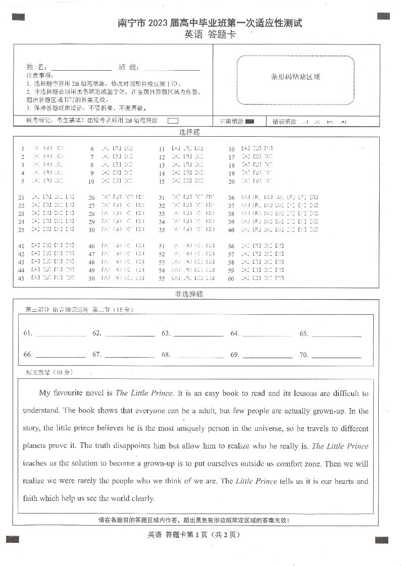高三英语答案--广西壮族自治区南宁市2023届高中毕业班第一次适应性测试