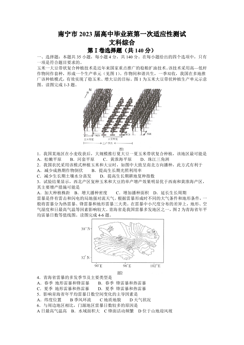 高三文综+答案--广西壮族自治区南宁市2023届高中毕业班第一次适应性测试