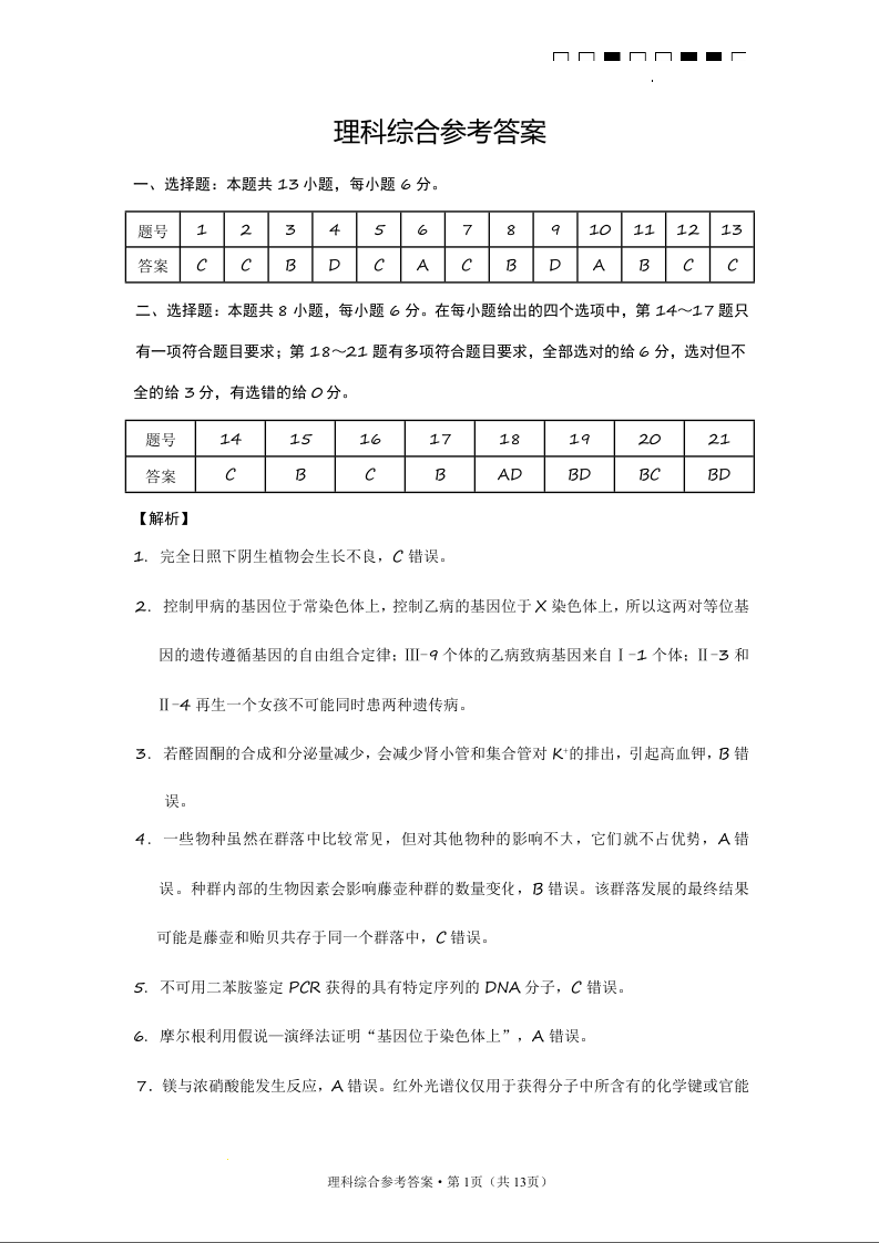 高三理综答案--云南师范大学附属中学2023届高三第九次高考适应性月考(云南版)