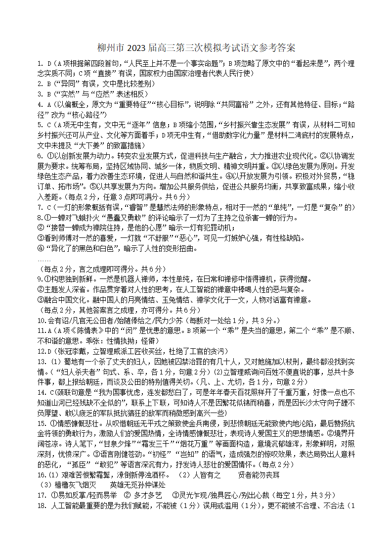 高三语文答案--广西柳州市2023届高三三模