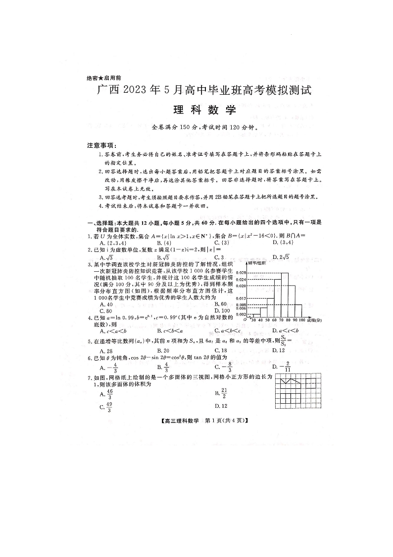 高三理数--广西2023年5月高中毕业班高考模拟测试(三模)