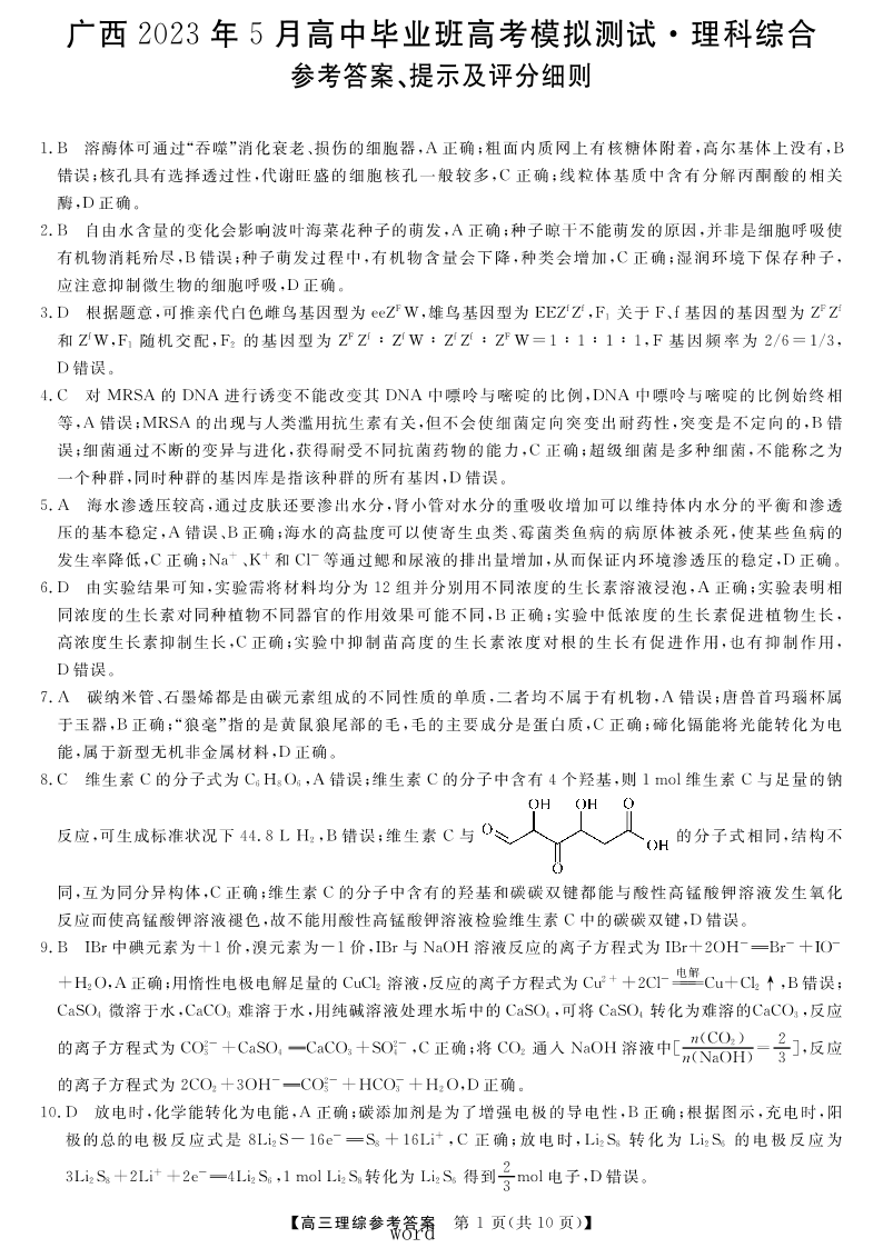 高三理综答案--广西2023年5月高中毕业班高考模拟测试(三模)