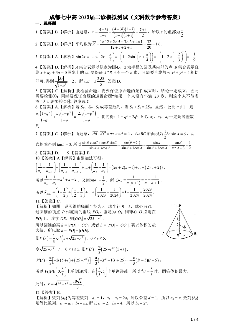 高三文数答案--四川省成都市第七中学2023届高三下学期二诊模拟考试