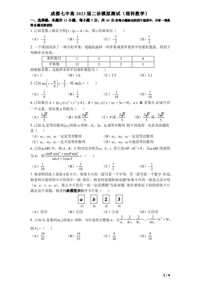 高三理数--四川省成都市第七中学2023届高三下学期二诊模拟考试