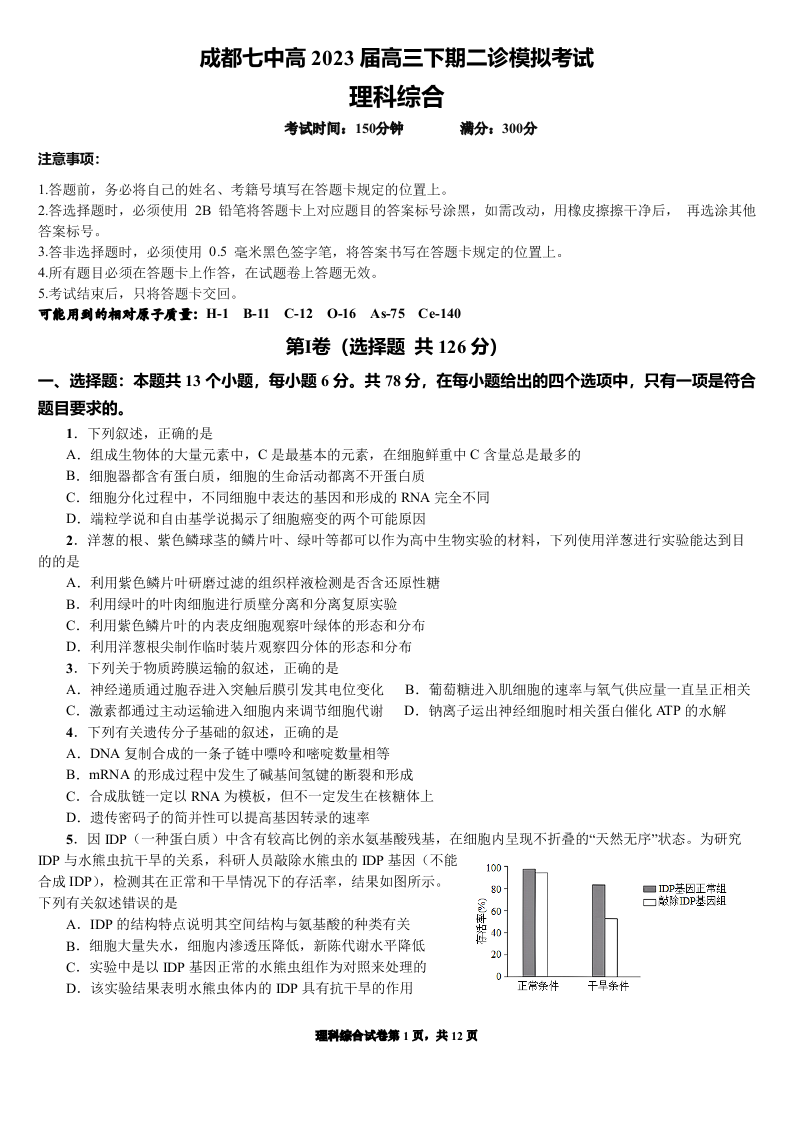 高三理综--四川省成都市第七中学2023届高三下学期二诊模拟考试