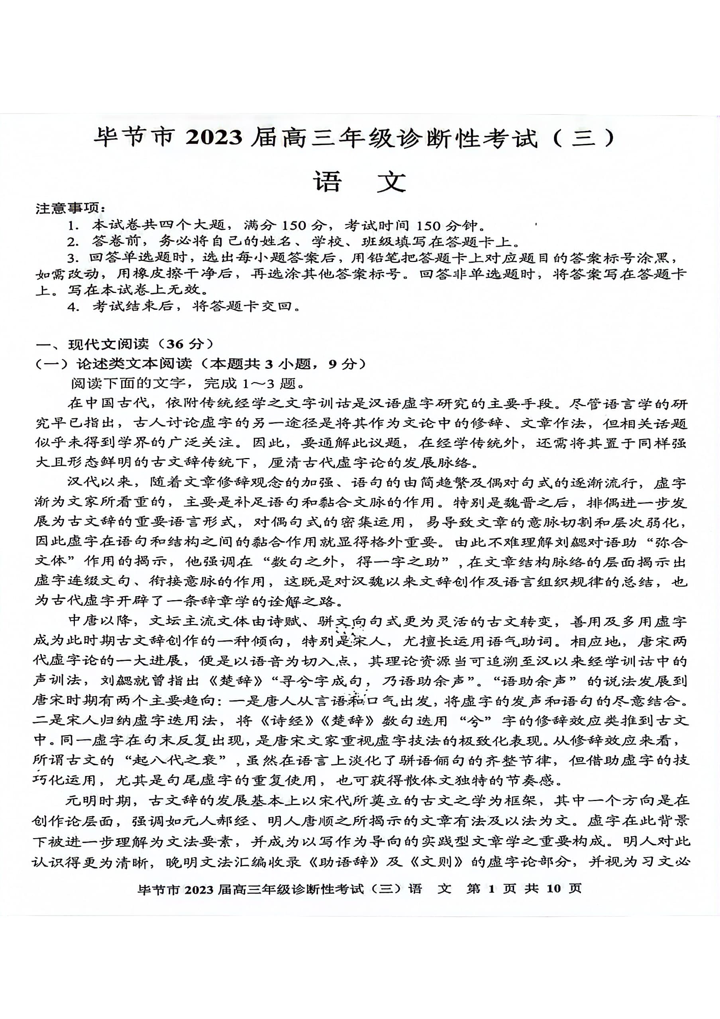 高三语文--贵州省毕节市2023届高三诊断性考试(三)(毕节三诊)