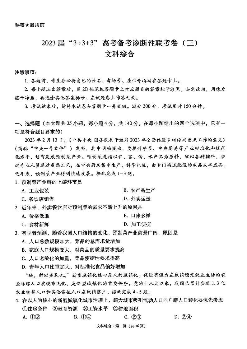 高三文综--贵州省贵阳市2023届高三3+3+3高考备考诊断性联考(三)
