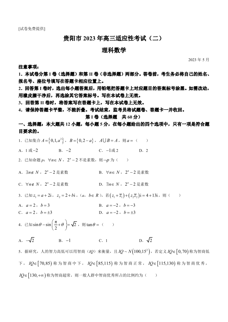 高三理数--贵州省贵阳市2023届高三适应性考试(二)