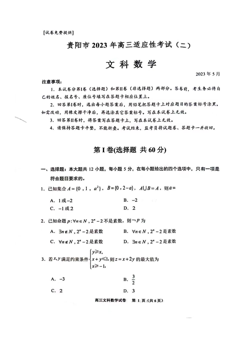 高三文数--贵州省贵阳市2023届高三适应性考试(二)