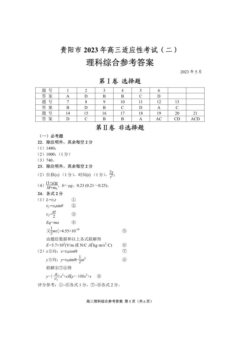 高三理综答案--贵州省贵阳市2023届高三适应性考试(二)