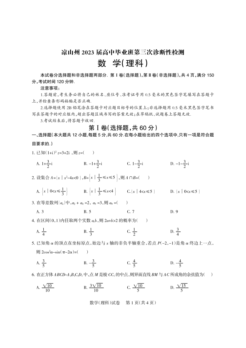 高三理数--四川省凉山彝族自治州2023届高三第三次诊断性检测