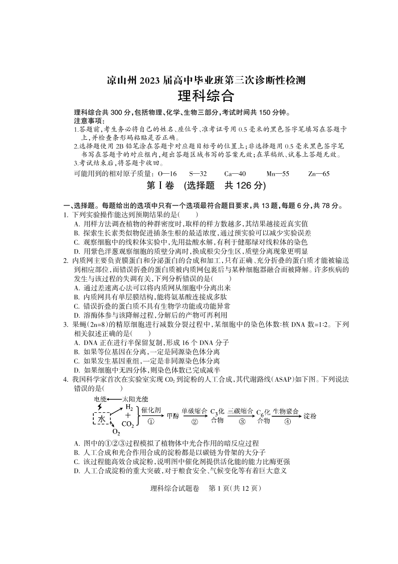 高三理综--四川省凉山彝族自治州2023届高三第三次诊断性检测