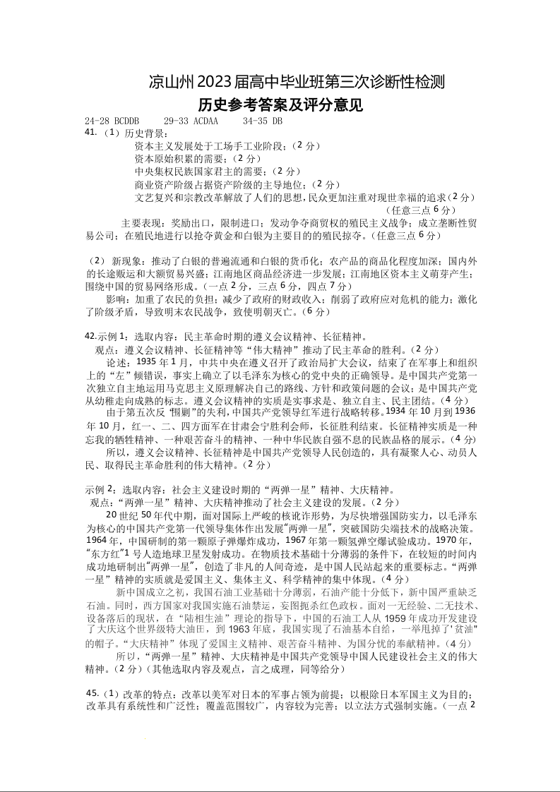 高三文综历史答案--四川省凉山彝族自治州2023届高三第三次诊断性检测