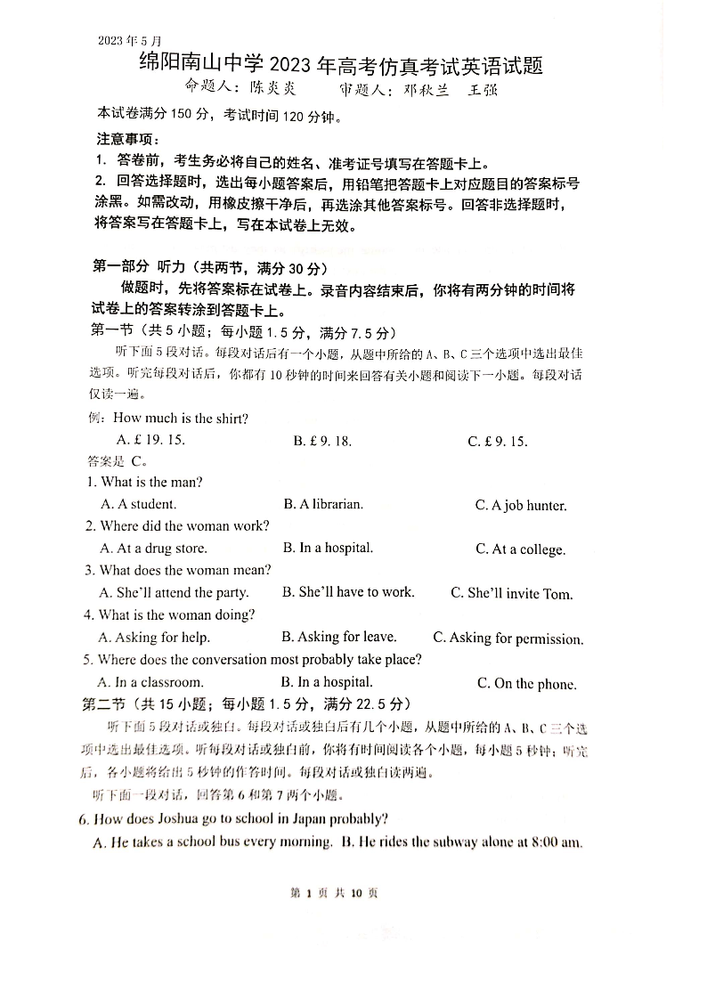 高三英语+答案--四川省绵阳南山中学2023届高三下学期高考仿真考试