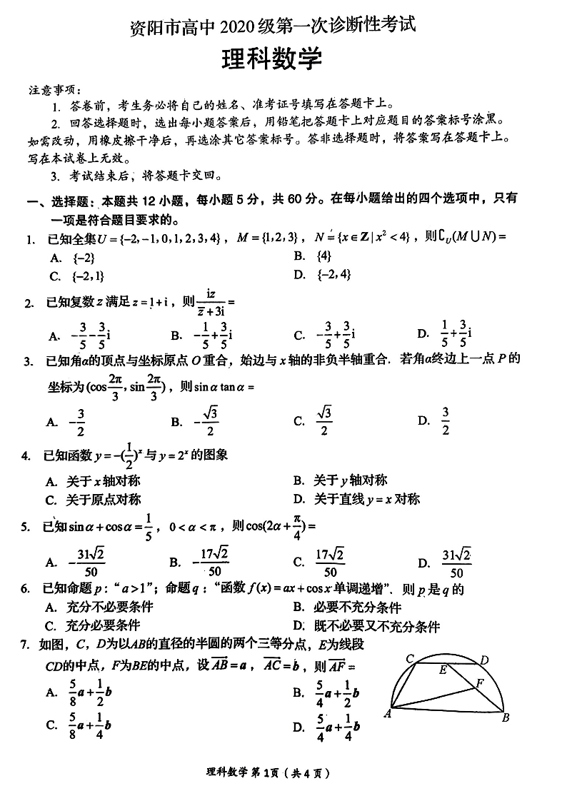 高三理数-四川省资阳市2023届高三上学期第一次诊断考试