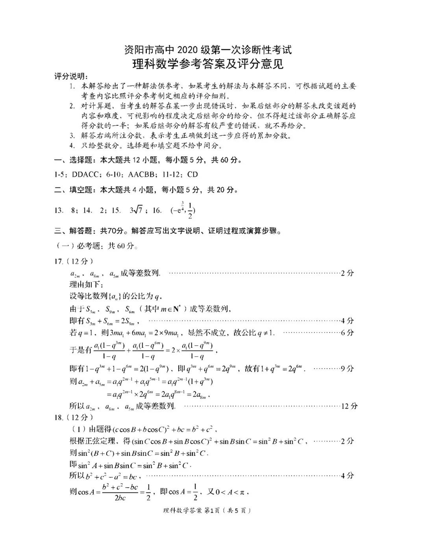 高三理数答案--四川省资阳市2023届高三上学期第一次诊断考试