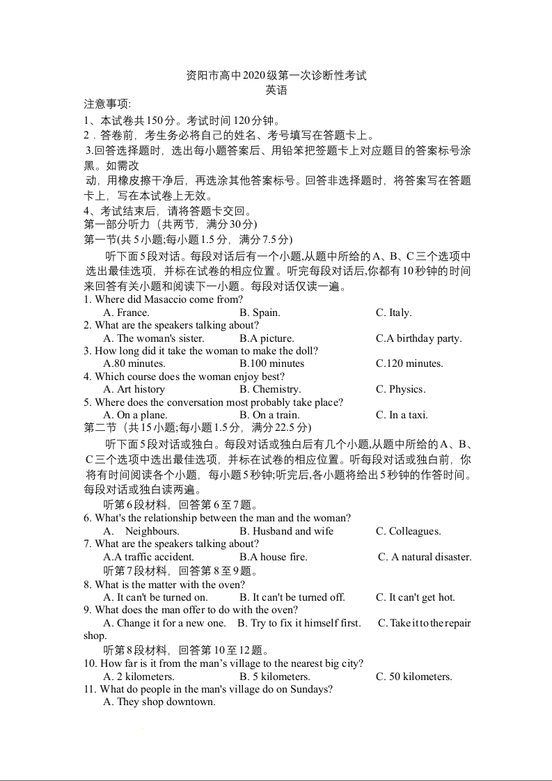 高三英语--四川省资阳市2023届高三上学期第一次诊断考试