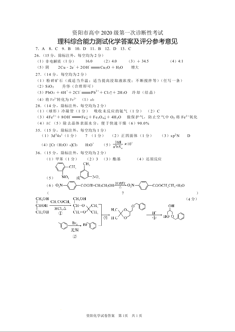 高三理综化学答案--四川省资阳市2023届高三上学期第一次诊断考试