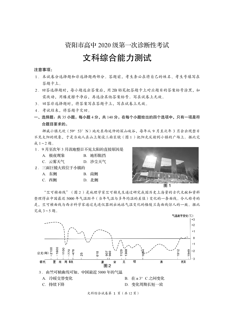 高三文综--四川省资阳市2023届高三上学期第一次诊断考试