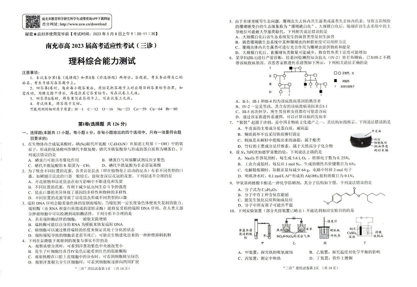 高三理综--四川省南充市高2023届高考适应性考试(南充三诊)