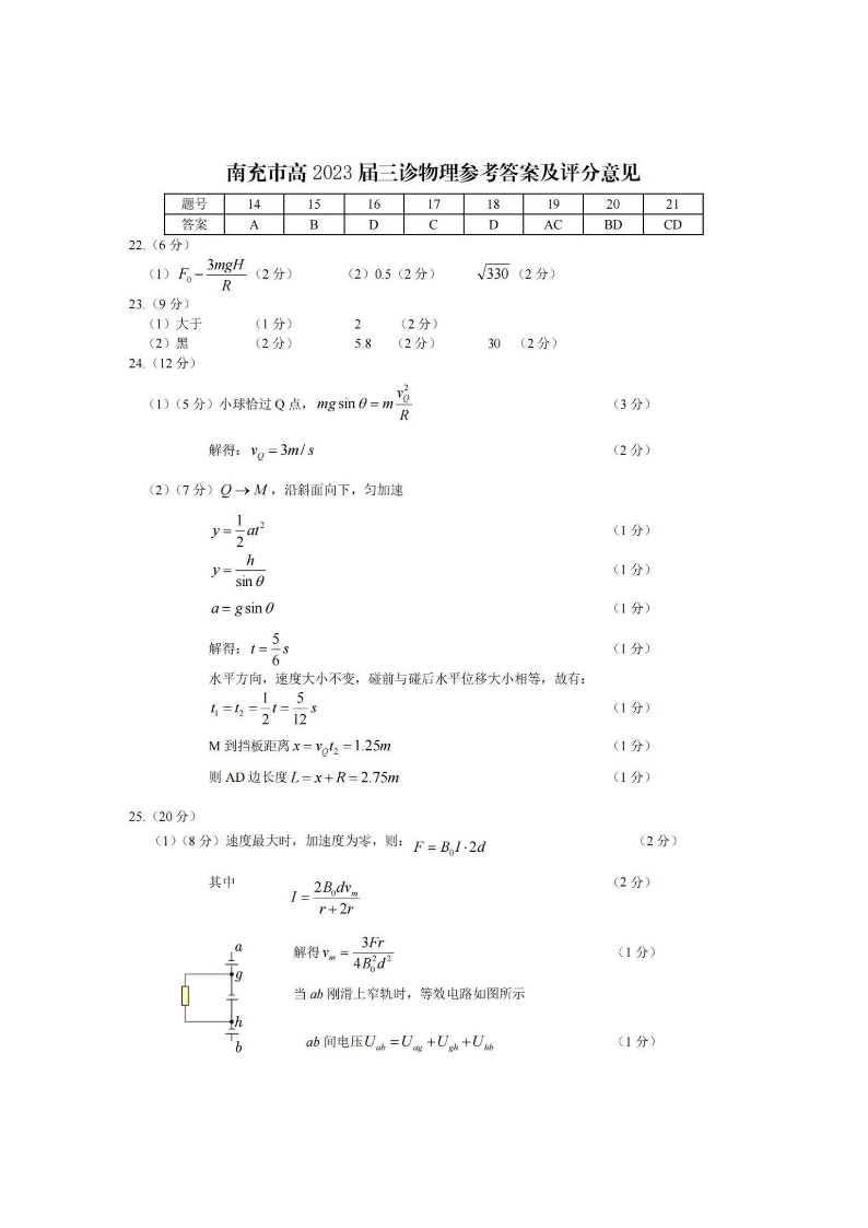 高三理综答案--四川省南充市高2023届高考适应性考试(南充三诊)