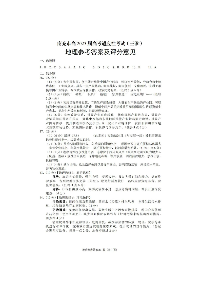 高三文综答案--四川省南充市高2023届高考适应性考试(南充三诊)