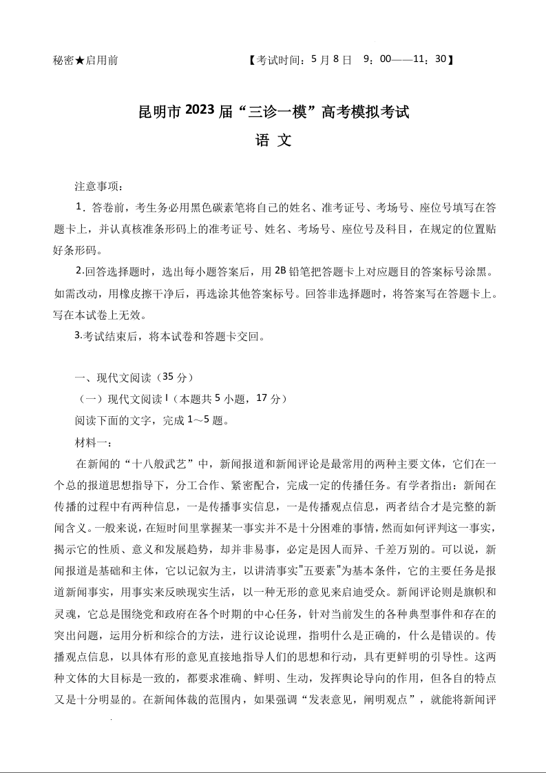 高三语文--云南省昆明市2023届“三诊一模”高考模拟考试(昆明二模)