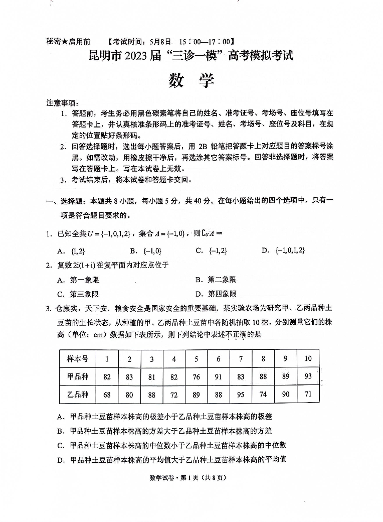 高三数学--云南省昆明市2023届“三诊一模”高考模拟考试(昆明二模)