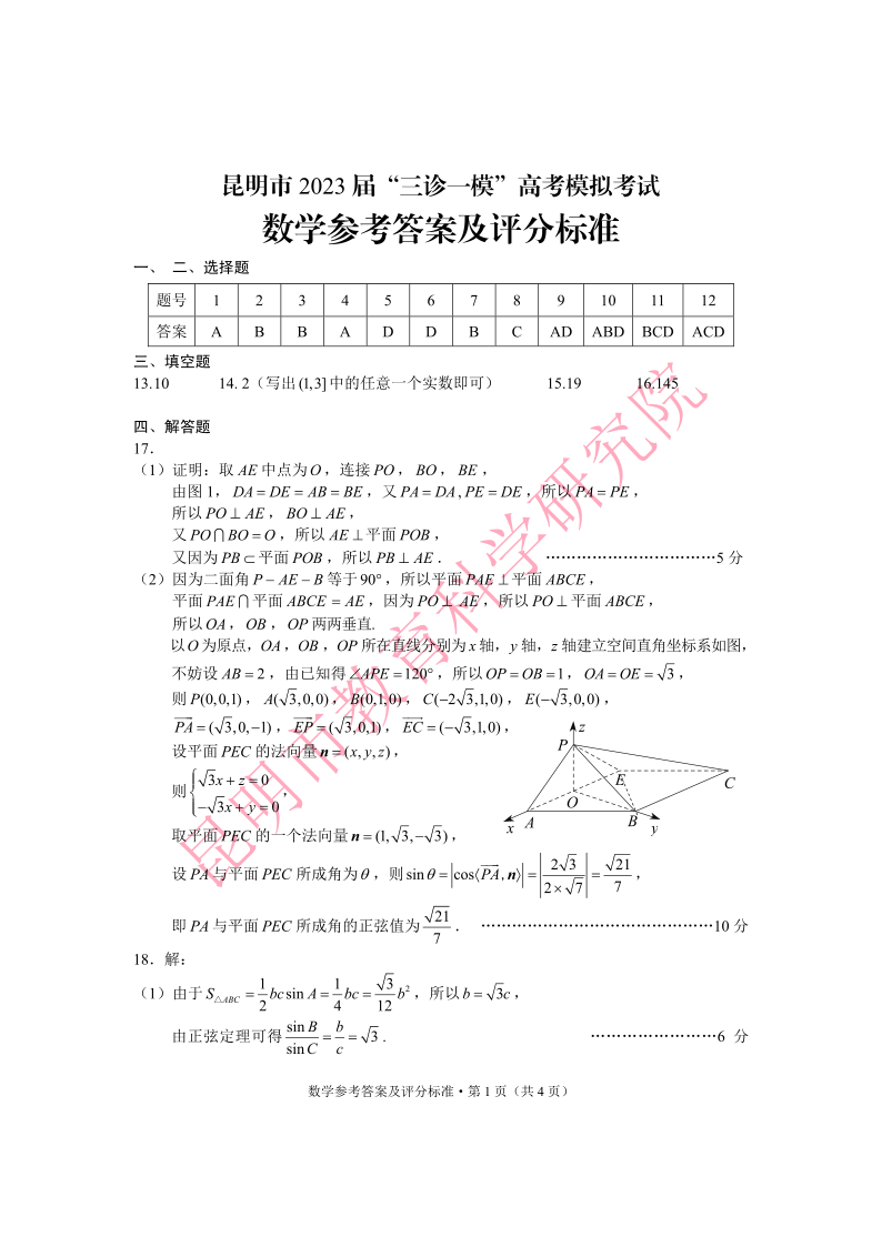 高三数学答案--云南省昆明市2023届“三诊一模”高考模拟考试(昆明二模)