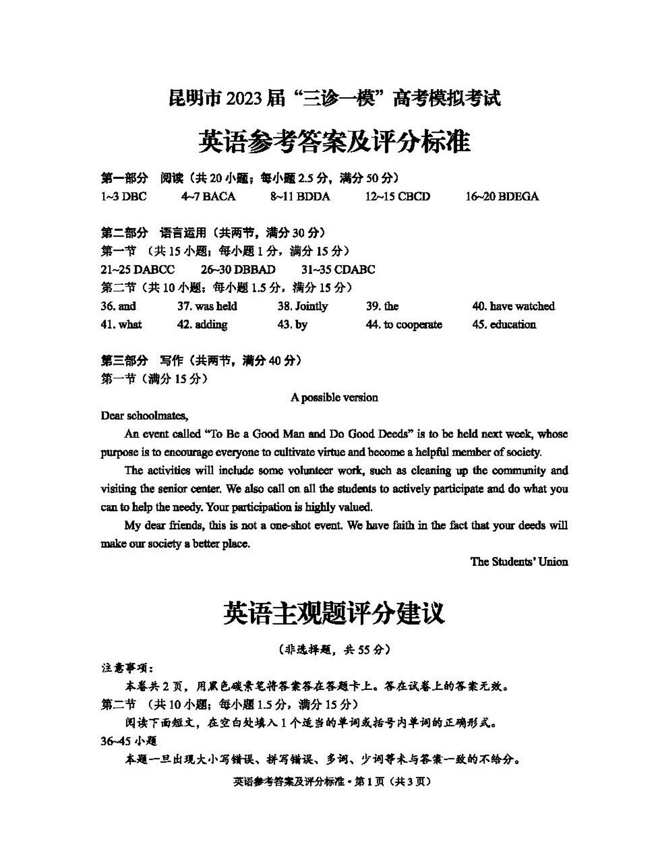 高三英语答案--云南省昆明市2023届“三诊一模”高考模拟考试(昆明二模)