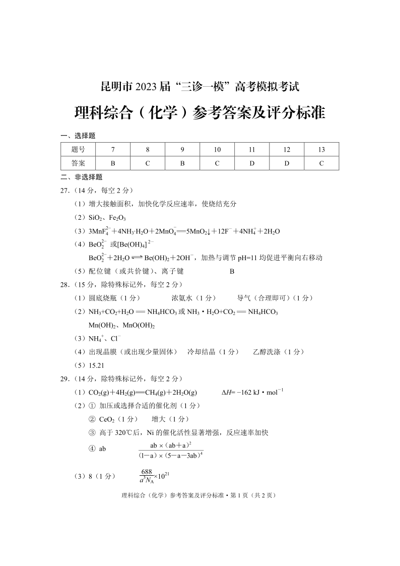 高三理综化学答案--云南省昆明市2023届“三诊一模”高考模拟考试(昆明二模)